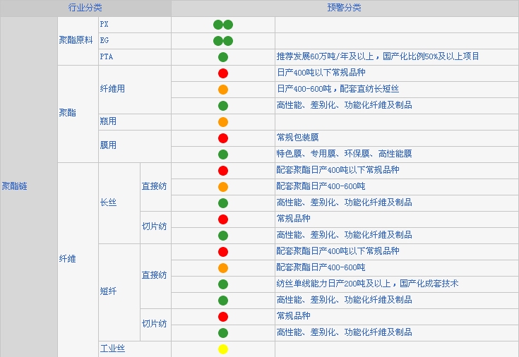 本預警系統(tǒng)以國家宏觀經濟政策、行業(yè)總體情況和各種基礎數據為基礎,實現(xiàn)對擬在建項目、上下游行業(yè)、市場狀況、技術水平、重點產品、產品價格等的跟蹤,及時了解行業(yè)可能發(fā)生的變化趨勢,建立起快速反應機制,為行業(yè)投資、生產、經營、定價等策略提供幫助。中國化學纖維工業(yè)協(xié)會將根據國內外行業(yè)運行實際情況和技術市場發(fā)展動向及時對預警系統(tǒng)進行修正調整。